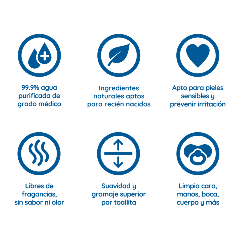 Nuestras toallitas húmedas solo están compuestas por dos ingredientes: 99.9% de agua purificada de grado médico y un 0.1% de aloe vera. No contienen fragancias ni alcohol, por lo que son aptas para recién nacidos y bebés con pieles sensibles.
